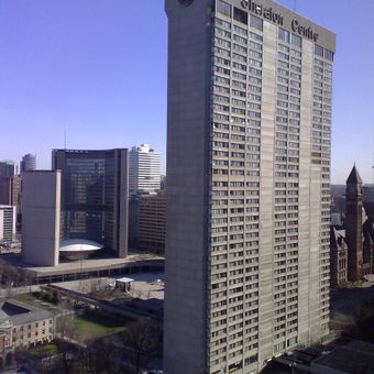 Sheraton Centre Toronto Hotel is a brutalist hotel and skyscraper rising 135 meters across 43 floors in downtown Toronto. The structure consists of three interconnected building sections arranged around a central interior courtyard.