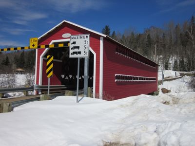 The bridge earned heritage status in 2001, representing Quebec's architectural legacy of covered bridges and traditional construction methods in Mauricie region.