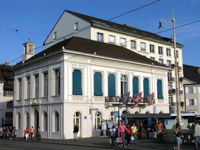 Café Spitz, Historic brasserie at Mittlere Brücke, Basel, Switzerland.
