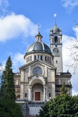 The Kirche Enge stands at 64 meters tall, featuring neo-Gothic architectural elements and an extensive pipe organ within its stone walls.