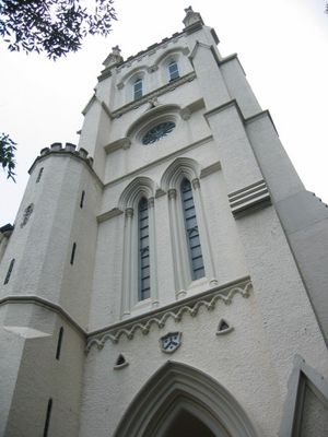The English Gothic architecture building features stone walls, pointed arches, and detailed stained glass windows within a cross-shaped floor plan.