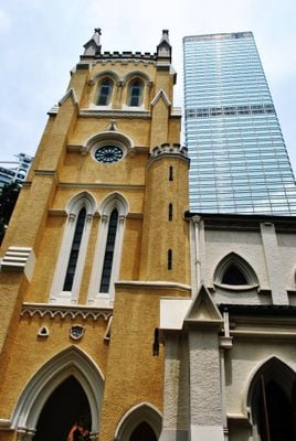 The cathedral stands as the only remaining colonial church structure in the Central business district, surrounded by modern skyscrapers and financial buildings.