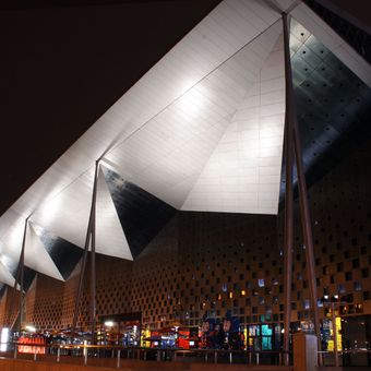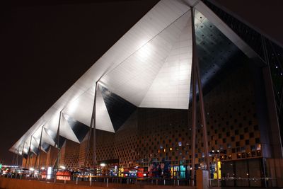 The roof incorporates solar panels that generate 2.8 million kilowatt-hours, demonstrating the building's commitment to sustainable energy production.