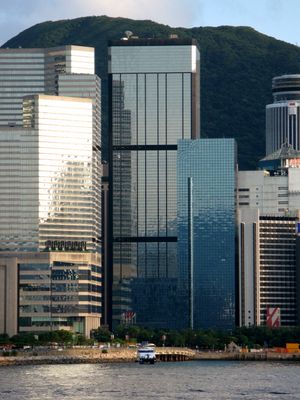 The Shui On Centre rises 118 meters into the sky with 35 floors of modern office space and a glass exterior in the business district.