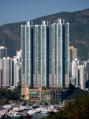Sham Wan Towers consists of three residential buildings reaching heights of 174 meters, featuring glass facades and contemporary architectural elements.