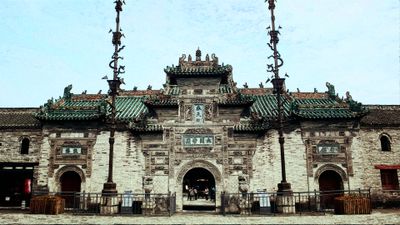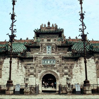 The three-bay archway entrance of Huaxilou leads to a 36-meter high structure featuring extensive dragon and flower carvings throughout its architecture.