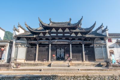 The Hu Clan Ancestral Hall features traditional Chinese architecture with wooden carvings, multiple courtyards, and ceremonial rooms dedicated to family gatherings and rituals.