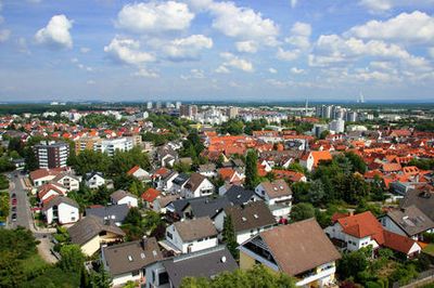 Dietzenbach is a town in the Offenbach district located southeast of Frankfurt am Main in a flat landscape. The town spreads across multiple districts with residential areas, commercial zones, and green spaces connected by local transportation networks.