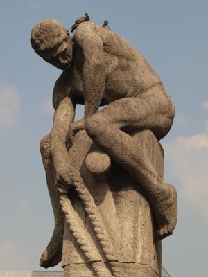 The statue represents the maritime heritage of Cologne, showing the strength and determination of dock workers who handled heavy ropes in the harbor.