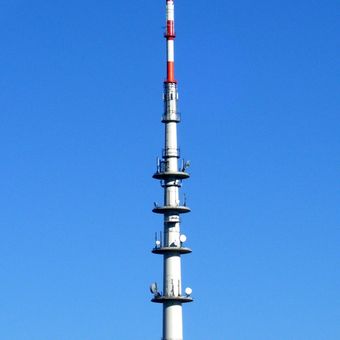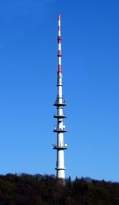 The 162-meter concrete tower on Glasenberg mountain houses communication equipment for radio, television, police, and fire brigade transmissions.