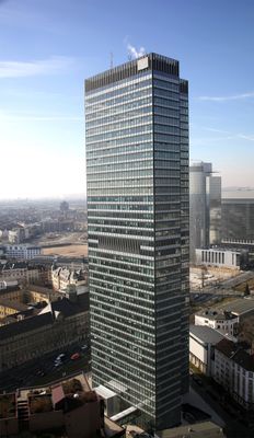 Located at coordinates 50.110278, 8.66, the building stands near public transportation connections and serves as headquarters for DZ Bank operations.