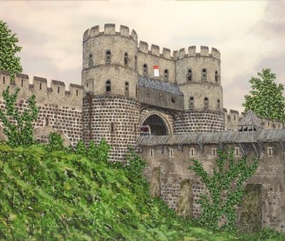 The Hahnentorburg stands as a double-towered gateway constructed from basalt and tuff stone at the western entrance of the medieval city wall.