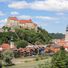 The town skyline is dominated by a castle complex that stretches over more than a kilometer along the hilltop ridge, making it the longest of its kind in Europe. Seen from the riverbank, the towers and walls form a continuous line above the entire old town.