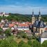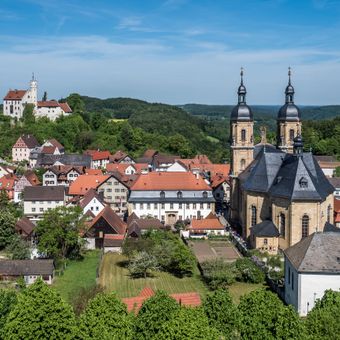 Gößweinstein is a market municipality in Forchheim District in Upper Franconia that has grown around a notable pilgrimage church and the remains of a medieval castle. The settlement has a compact structure with a church perched on a hillside, while the village sits nestled within the surrounding Franconian Forest landscape.
