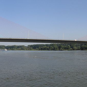 The Friedrich-Ebert Bridge extends 1,290 meters across the Rhine River, featuring two steel pylons rising 55 meters and supporting 80 steel cables in a harp configuration.