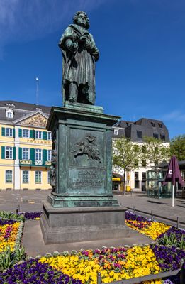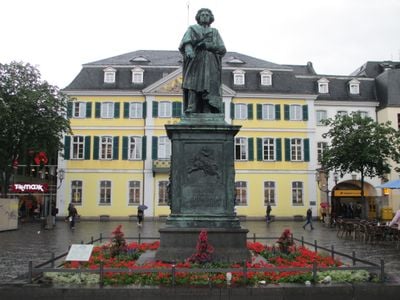 The Beethoven Monument stands 2.7 meters tall on Münsterplatz square, featuring the German composer cast in bronze with classical robes and a scroll in hand.