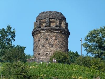 The Bismarck Tower in Radebeul stands as a stone structure on an elevated position, offering views across the Elbe River valley and Saxon wine country.