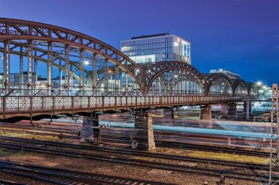 The Hackerbrücke spans 28.4 meters across railway tracks with six iron arches rising eight meters high on stone pillars near Munich Central Station.