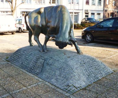 The Brander Stier stands as a life-sized bronze bull sculpture, forming a central element at the marketplace of Aachen-Brand district.