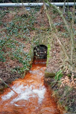 The iron-rich mine water flowing from the tunnel continues to stain the watercourse bed an orange-brown color due to oxidation processes.
