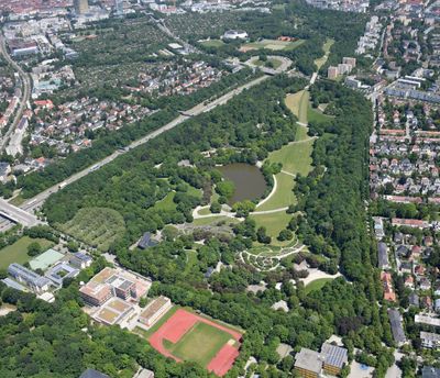 The 69-hectare green space extends 2.4 kilometers from east to west, divided by Garmischer Street with a connecting pedestrian bridge.