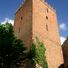 The remaining structures include a 25-meter bergfried tower in the northeastern corner, a pointed arched entrance gate, and sections of surrounding walls.