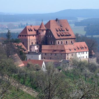 The stone fortress stands at 450 meters above sea level, offering views across the Rezat Valley from its hilltop location in Middle Franconia.