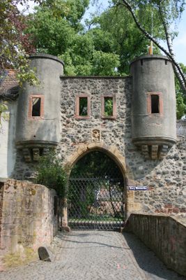 The castle stands on elevated terrain near the Nidder River, featuring two gate structures from the 16th century and remnants of the original ring wall.