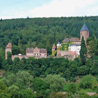 Zwingenberg Castle sits on a hilltop overlooking the Neckar River, positioned between a steep gorge and the river valley below. The compound features medieval buildings and exhibition rooms that visitors can explore through guided tours.