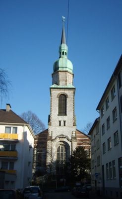 The Christuskirche is a Protestant church in Wuppertal-Elberfeld with a square tower that rises approximately 70 meters high. The tower ends in an octagonal spire clad in copper, which creates a distinctive outline visible across the district.