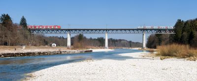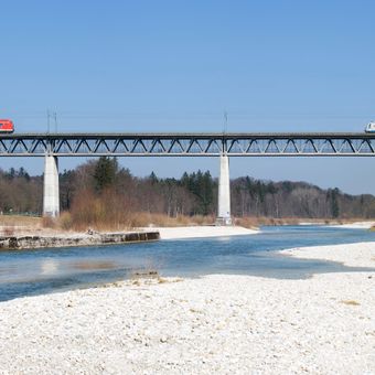 The lower level of the bridge contains a wide pathway for pedestrians and cyclists, while the upper deck serves the Bavarian Oberland Railway transportation system.