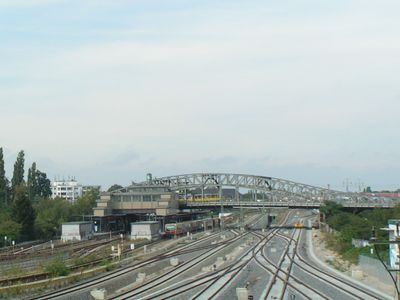 Located near Bornholmer Straße station, the bridge serves vehicle traffic and pedestrians while spanning both regional and S-Bahn train tracks below.