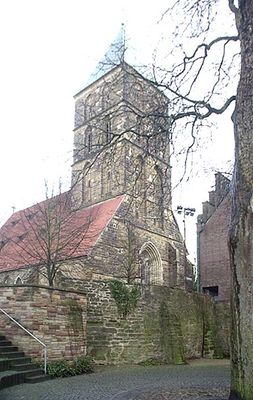 St. Dionysius is a Gothic parish church that stands on the northern edge of Rheine's marketplace, perched on a limestone spur above the Ems River bank. The building displays characteristic pointed arches and houses an extensive collection of liturgical items and artworks from various periods spanning centuries.