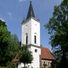 The stone church features a pentagonal choir, medieval nave structure, and a brick Gothic vestibule added during the nineteenth century reconstruction.