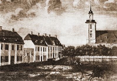 The palace houses a former theater and workshop space where Ludwig Nicolaus Friedemann Hunold produced innovative stoneware inspired by Josiah Wedgwood's techniques.