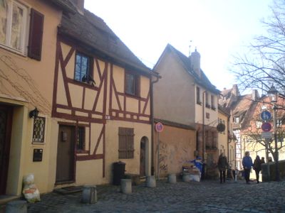 The buildings line Am Ölberg street at the base of Nuremberg Castle, near the oldest half-timbered house in the city from 1338.