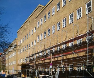 The four-story Stadtbad Mitte features clinker brick facades, dimension stone details, and ceramic finishes throughout its New Objectivity style architecture.