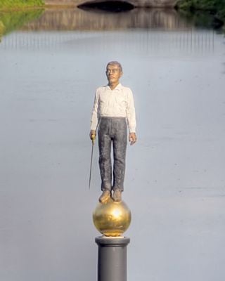 The bronze sculpture, created by Stephan Balkenhol in 2004, depicts a modern man in black pants and white shirt standing on a golden sphere.