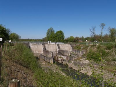 The hydraulic structure maintains a flood discharge capacity of 180 cubic meters per second, ensuring water flow control between the Emscher River and canal system.