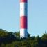 The cylindrical concrete tower rises 40 meters above the Elbe River, featuring a white exterior with two horizontal red bands and a red lantern house.