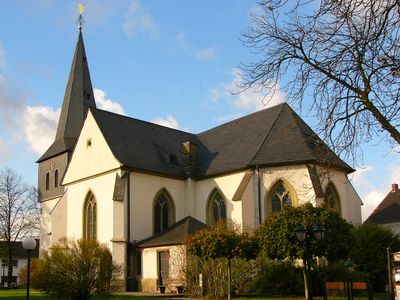 The St. Pankratius Protestant Church features green sandstone walls, a wide transept, and a three-sided choir that rises above the low nave structure.