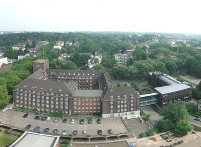 The Polizeipräsidium Bochum features a seven-story corner tower decorated with a limestone relief of the Prussian eagle on its exterior facade.