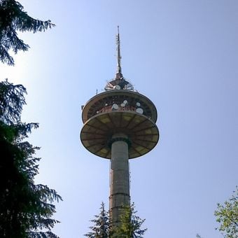The tower transmits DVB-T2 HD television signals, digital radio broadcasts, and houses multiple amateur radio relay stations for various frequency bands.