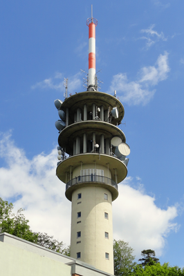 The tower combines modern transmission technology with public access, providing views of the Baden-Baden basin, Rhine Plain, and Vosges mountains.