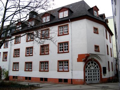 The Algesheimer Hof stands at the corner of Christophsgässchen and Hintere Christophsgasse near Karmeliterplatz in the old town of Mainz.