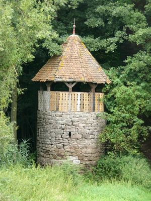 The castle stands on a manmade lake in the Bibert valley, featuring a rectangular bergfried that rises 20 meters with walls 2 meters thick.