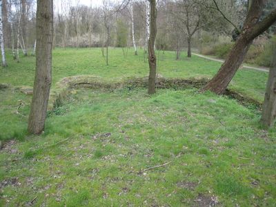 The remains of Haus Mengede include foundation walls that outline the structure of a former water castle with moats and fortifications.