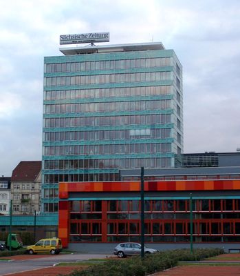 The Haus der Presse is a 13-story office building located on Ostra-Allee 20, distinguished by its modern glass facade composed of 4,000 panels. These panels feature typography and graphic designs that give the structure its recognizable appearance in the city.