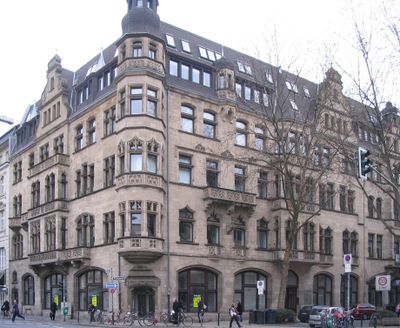 The four-story corner building features stone facades, decorated balconies, tracery structures on windows, and characteristic turrets at Stresemannstraße 26.