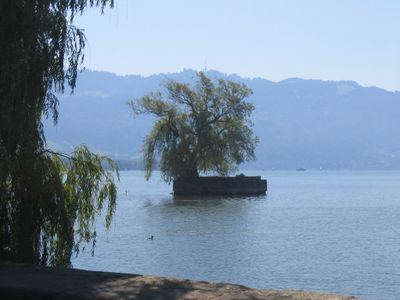 The small land mass rises from Lake Constance waters near Lindau, forming a natural extension of the shoreline with native water plants.